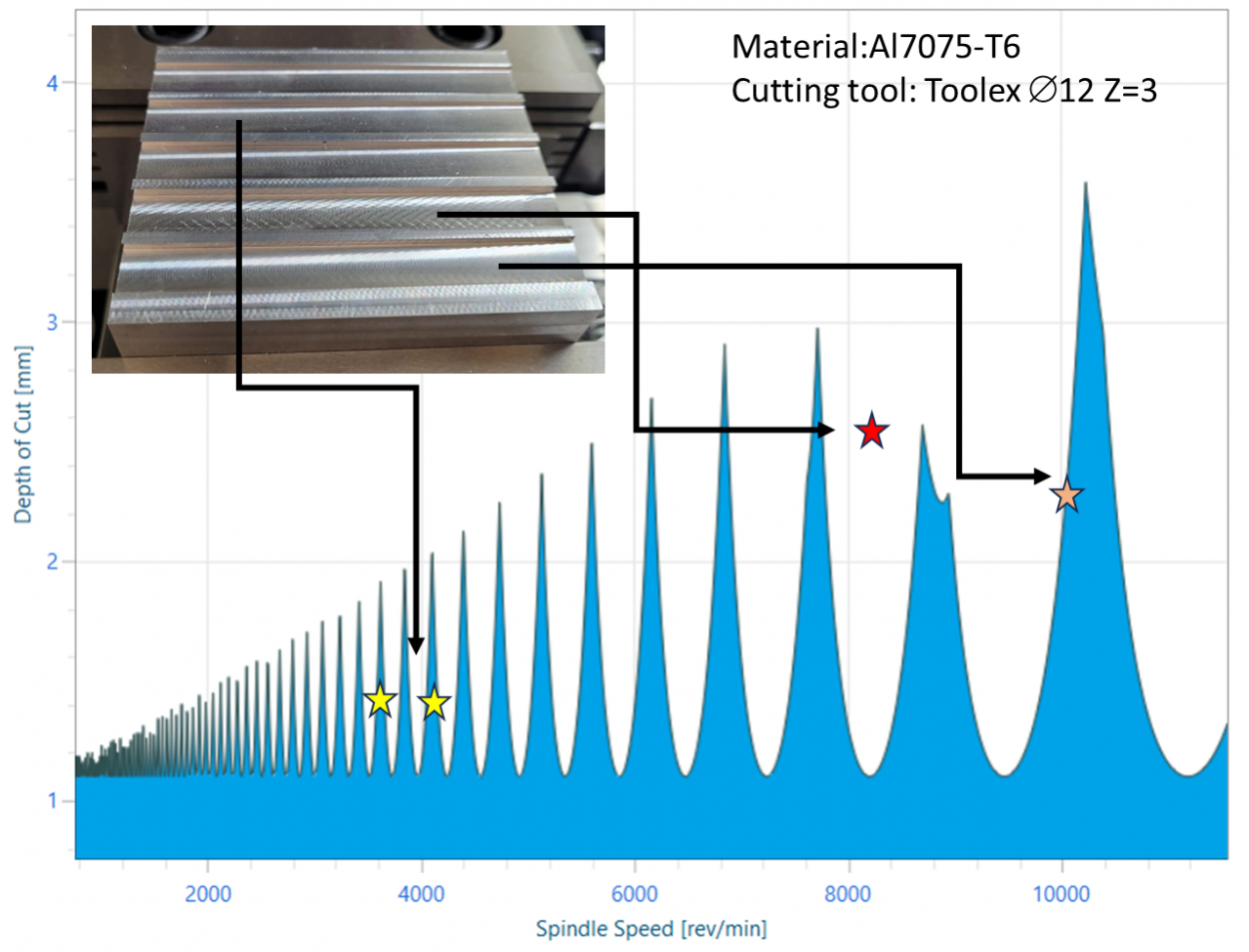 • Kırmızı yıldızlar, rezonans etkisinin görüldüğü ve yüzey kalitesinin bozulduğu kesme bölgelerini göstermektedir.